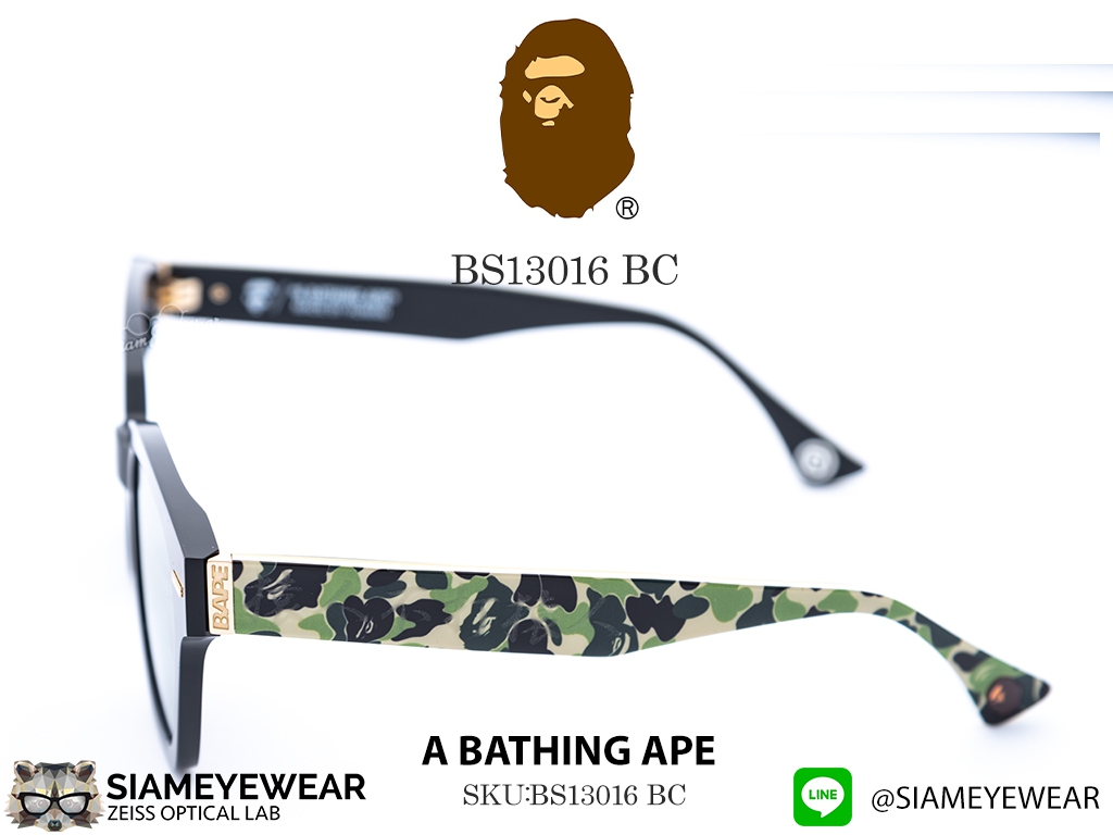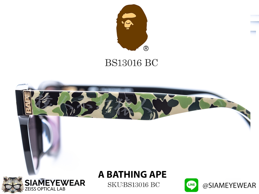 รุ่น BS13016 นำทรง Aviator อันเป็นตำนานมาผสมผสานกับความเป็น Streetwear ของ BAPE สีดำคู่กับลาย Camo บนขาแว่น สร้างความแตกต่างจากแว่น Aviator ทั่วไป