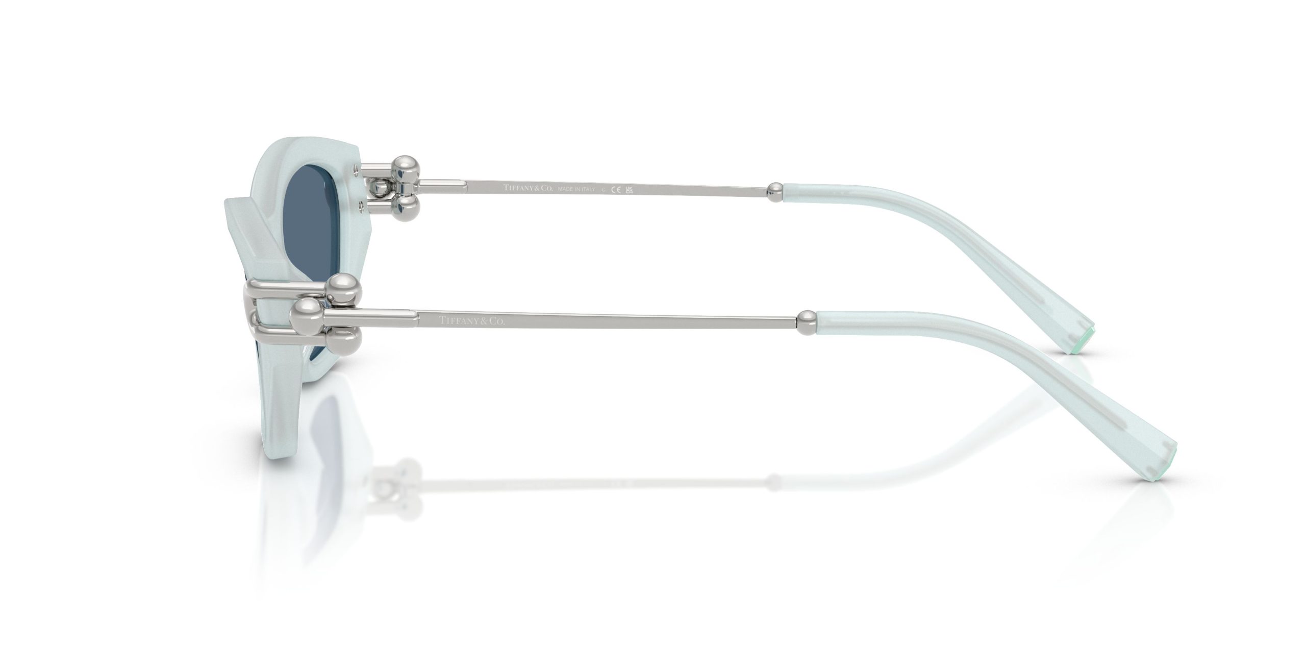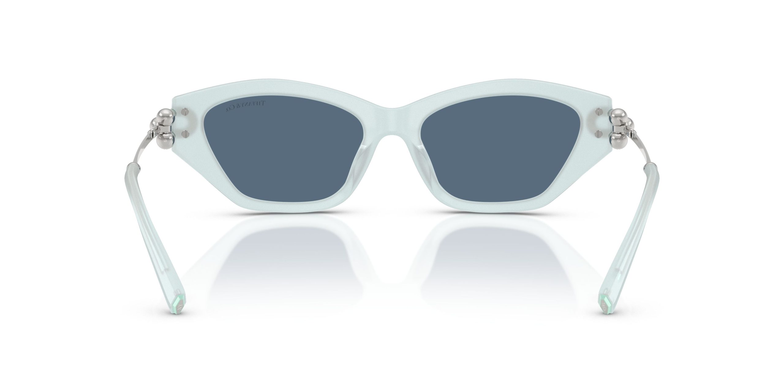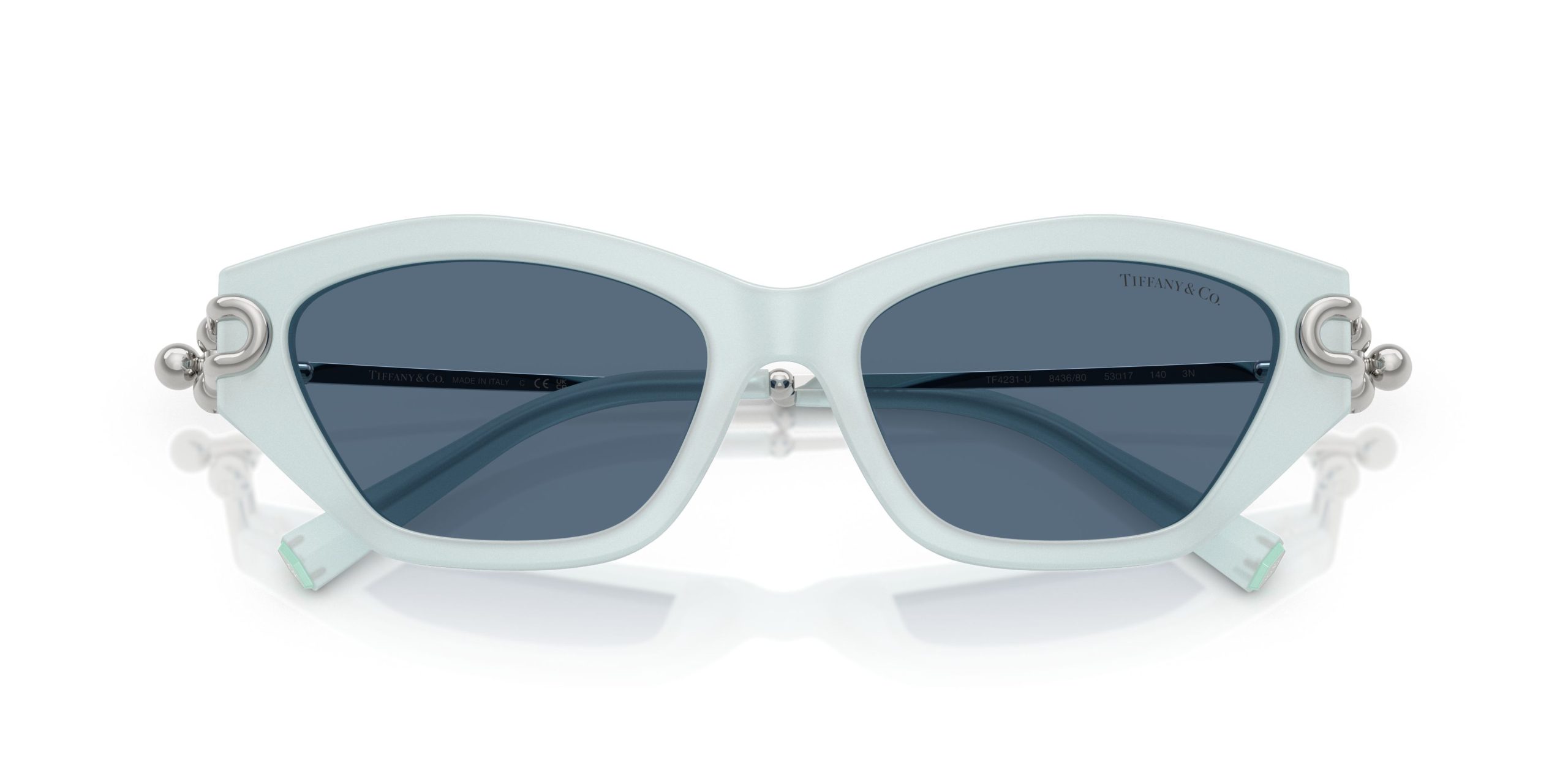 TF4231U รหัสสี 843680 เป็นแว่นกันแดดผู้หญิงจาก Tiffany & Co ทรงตาแมว (Cat-eye) คลาสสิกที่มีมุมแหลมยกขึ้นด้านบน ตัวหน้ากรอบทำจากอะซิเตทสี Frosted Pale Sapphire Blue (สีไพลินซีดเนื้อน้ำค้างแข็ง) ที่เป็นสีน้ำเงินอ่อนแบบ Matte Finish ไม่เงา ขาแว่นเป็นโลหะสีเงินจับคู่กับปลายขาอะซิเตทสีเดียวกัน เลนส์เป็นสีน้ำเงินเข้มทึบ (Solid Dark Blue) ตัดกับโทนกรอบอ่อน โลโก้ T ทองสลักที่บานพับ เป็นรุ่นสะสมของคนที่ชอบแว่นกันแดดสีแปลกที่หาซื้อได้ยาก