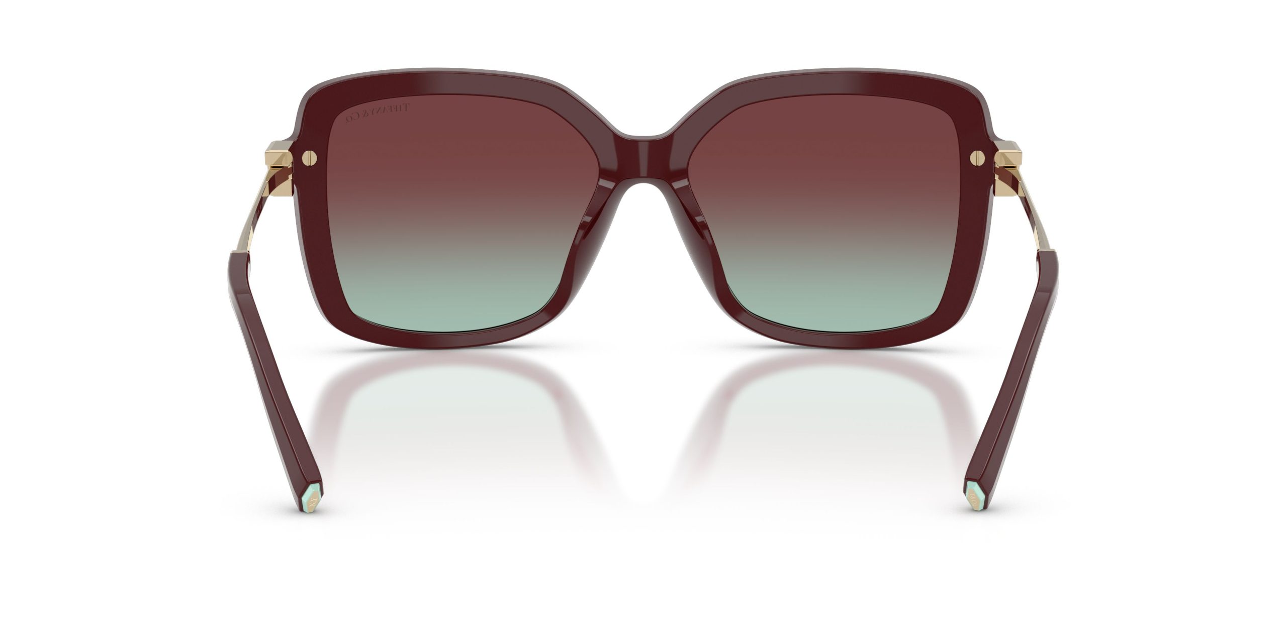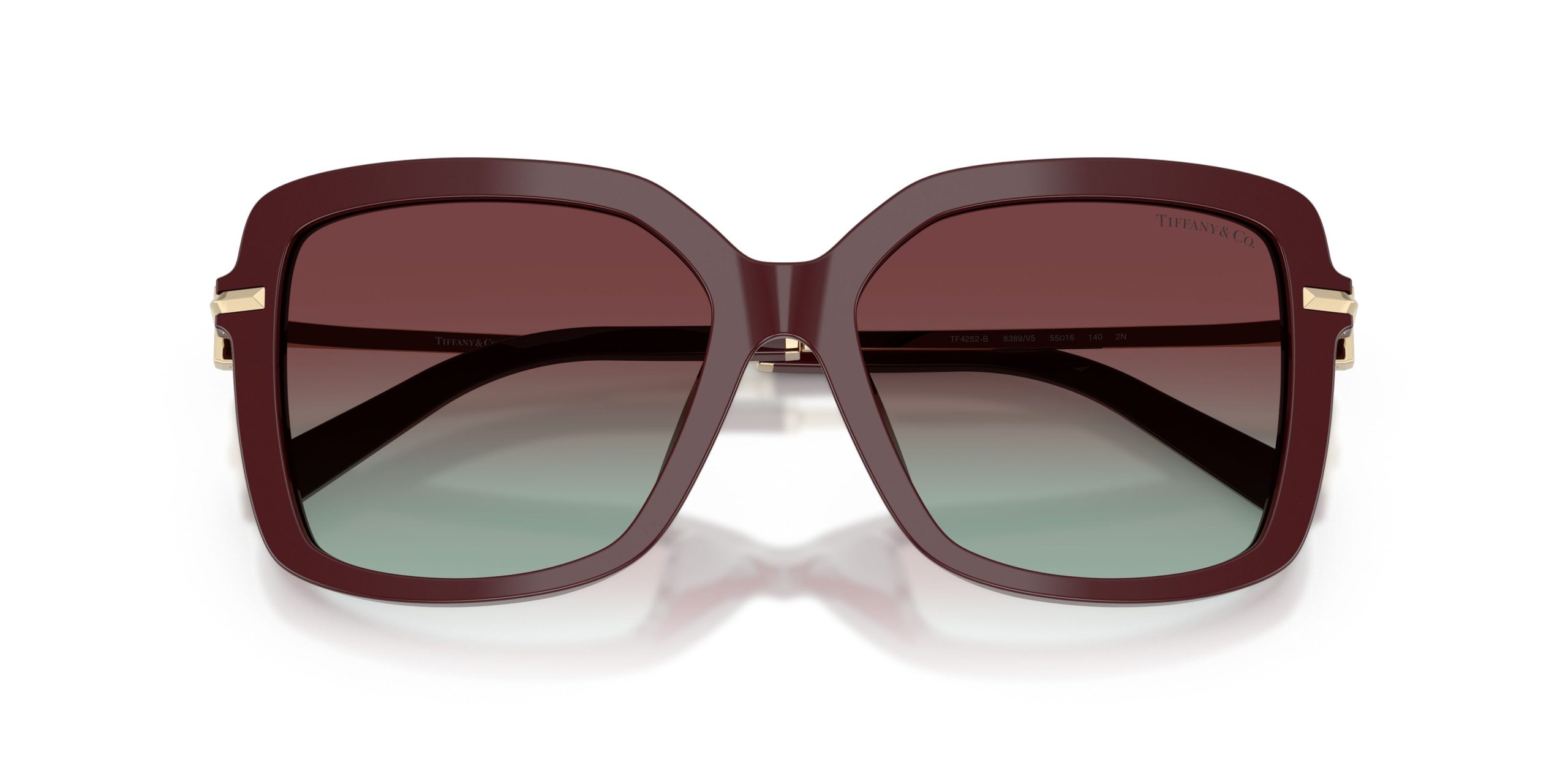 Tiffany & Co TF4252B 8389V5: แว่นกันแดดทรงสี่เหลี่ยมจัตุรัสเต็มขอบ กรอบอะซิเตทสีเบอร์กันดี (แดงไวน์) ขาแว่นโลหะสีเบอร์กันดี เลนส์ Azure/Burgundy ฟิตติ้ง B-variant คานสูงไซส์แคบ สะพานจมูก 16 มม. ขนาดเลนส์ 55 x 48 มม. น้ำหนัก 249 กรัม เหมาะกับสุภาพสตรีรูปหน้าวงรีและกลมที่อยากได้แว่นกันแดดสี่เหลี่ยมสีเบอร์กันดีแดงไวน์ซึ่งเป็นสีที่คลาสสิกและดูโตกว่าแว่นสีดำทั่วไป