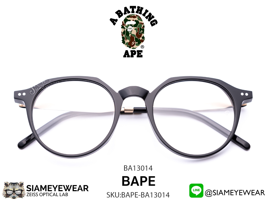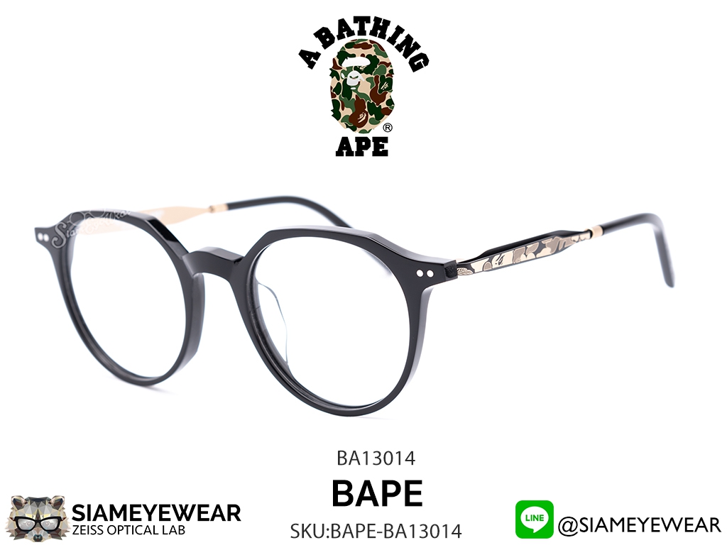รุ่น BA13014BG มาพร้อมทรงกลม Boston ที่ได้รับความนิยมในหมู่คน Streetwear กรอบหน้าเป็น Acetate สีดำเงา ขาแว่นเป็นโลหะสลักลาย Camo อันเป็นเอกลักษณ์ของ BAPE การผสมผสานวัสดุสองชนิดทำให้แว่นดูมีมิติและน่าสนใจ
