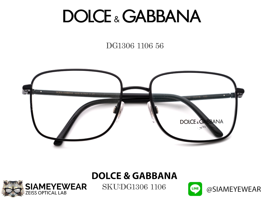 กรอบแว่นสายตา Dolce & Gabbana DG1306 1106 สีดำ กรอบโลหะทรงเหลี่ยมมินิมอล ขนาด 56 มม. น้ำหนักเบา ดีไซน์เรียบหรูสำหรับทุกโอกาส ผลิตโดย Luxottica ประเทศอิตาลี